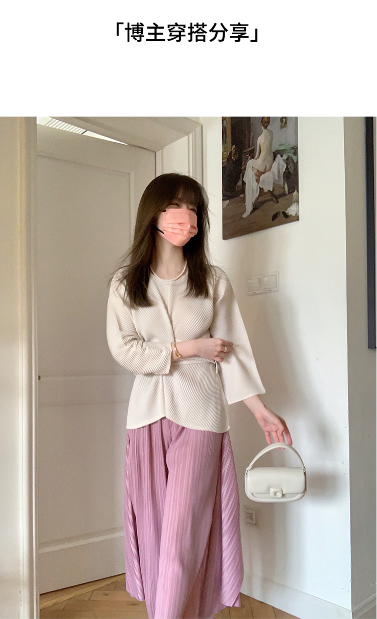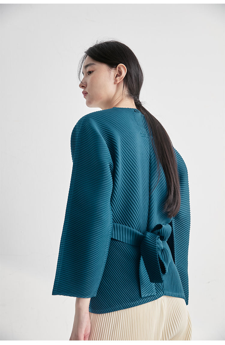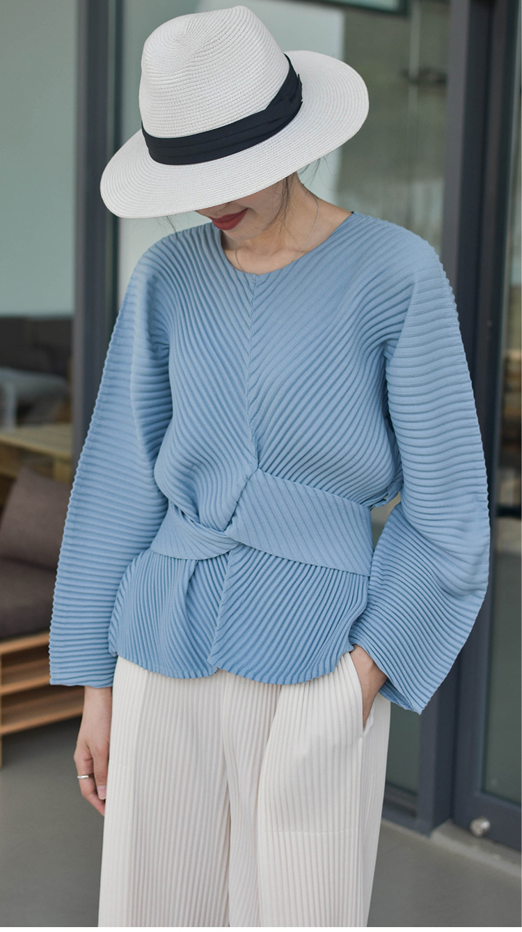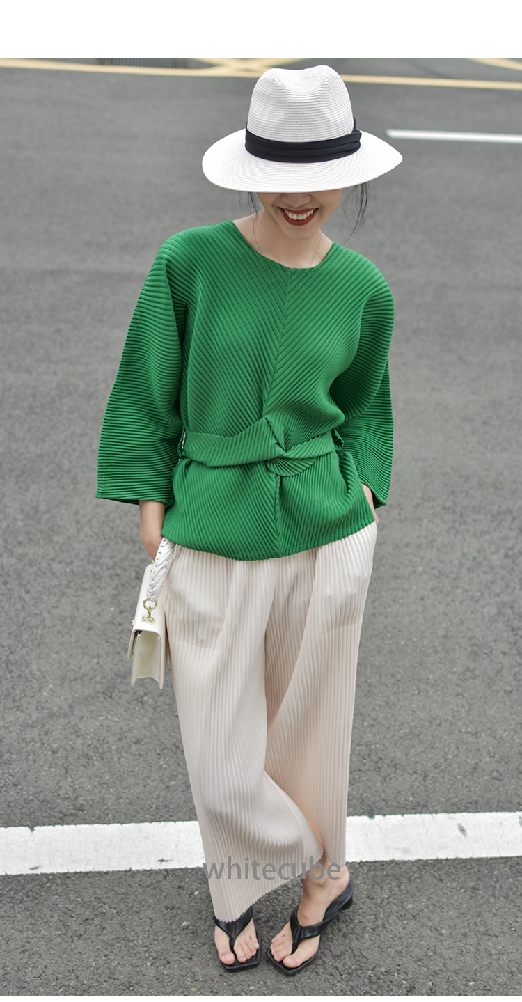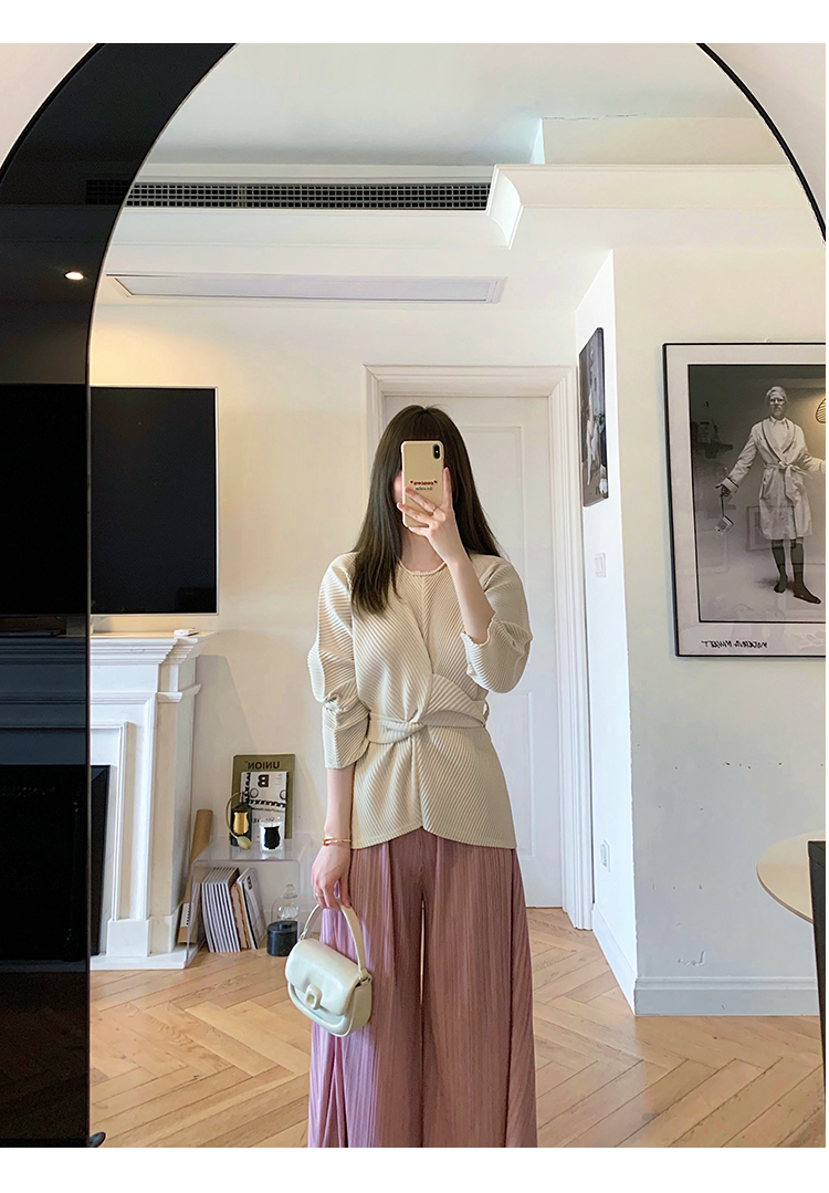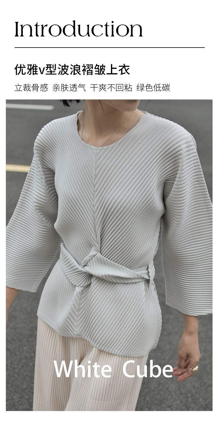 Asaya704 - Whitecube2024 Spring Miyake style pleated round neck tied waist shirt loose hanging shirt top for women