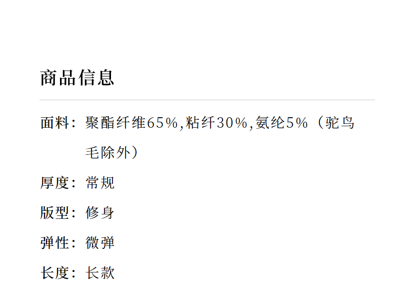 | Material composition | Polyester fiber 65% viscose fiber (viscose fiber) 30% polyurethane elastic fiber (spandex) 5% |