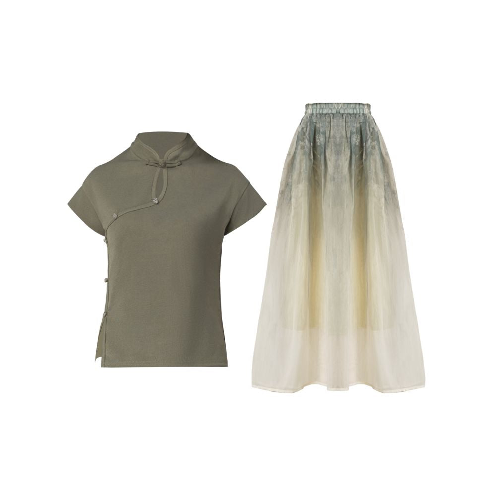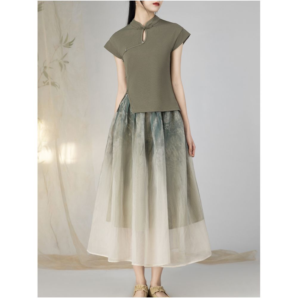 ASAYA2523 New Chinese style green knitted top summer button up collar retro small flying sleeve design T-shirt